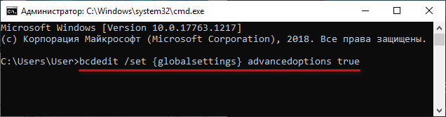 - Вводим bcdedit /set {globalsettings} advancedoptions true и жмем «Enter».