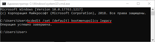 - Введите в консоль bcdedit /set {default} bootmenupolicy legacy и нажмите «Enter».