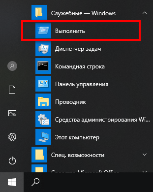 - Через меню «Пуск», найдите и откройте окно «Выполнить».