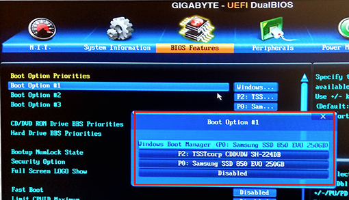 - Переместитесь в раздел «Boot» или аналогичный. Затем найдите ранее созданный загрузочный накопитель и укажите его в опции «Boot Option 1». Это изменит приоритет загрузки, накопитель выставится на первое место.