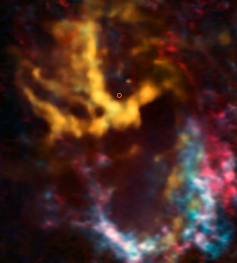 На этом снимке, сделанном с помощью комплекса радиотелескопов ALMA (Atacama Large Millimeter Array), запечатлена область вокруг расположенного в центре нашей Галактики компактного радиоисточника Стрелец А*. По мнению астрономов, он представляет собой сверхмассивную черную дыру, масса которой превышает солнечную в 4,3 млн раз. Положение радиоисточника отмечено кружком.