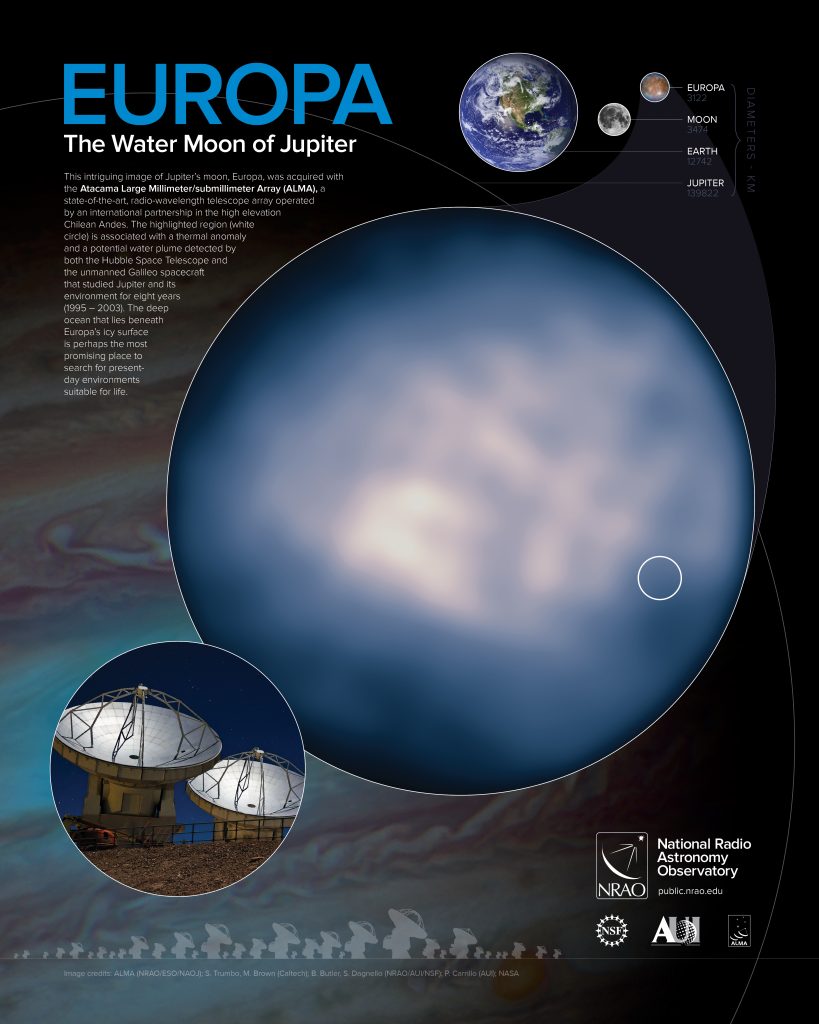 В отличие от обычных оптических телескопов, которые регистрирующих только отраженный свет, ALMA может улавливать тепловое излучение, испускаемое даже относительно холодными объектами — вроде комет или ледяных лун планет-гигантов. Благодаря этой особенности комплекс смог получить четыре изображения Европы с разрешением около 200 км. Затем ученые дополнили их тепловой моделью, созданной на основе наблюдений, которые выполнил в 1990-х гг. аппарат Galileo. Это позволило построить первую глобальную карту теплового излучения поверхности спутника.