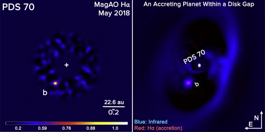В начале июля группа ученых из Института астрономии Макса Планка в Гейдельберге объявила о получении прямого изображения экзопланеты PDS 70b. Она формируется в газово-пылевом диске молодой звезды, расположенной на расстоянии 370 световых лет от Солнца в созвездии Центавра. Открытие было сделано при помощи приемника SPHERE, установленного на Очень большом телескопе Европейской Южной обсерватории ESO (VLT).