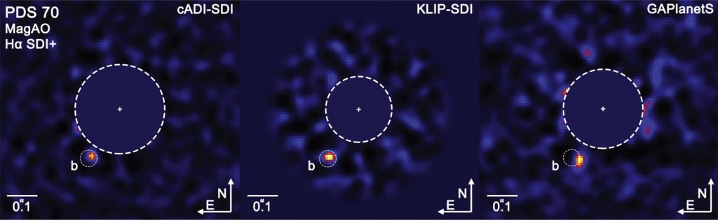Изображения звезды PDS 70 и ее планеты, полученные на длине волны 656 нм (линия Hα). Источник: Wagner et al. 2018]