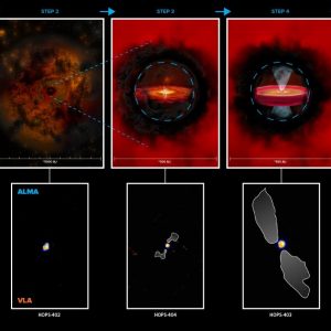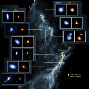Благодаря использованию комплексов радиотелескопов VLA (Very Large Array) и ALMA (Atacama Large Millimeter/submillimeter Array) астрономы сумели заглянуть внутрь Облака Ориона — скопления межзвездного вещества, находящегося на расстоянии 1600 световых лет от Солнечной системы.Поперечник Облака составляет несколько сотен световых лет, внутри него расположены одни из ближайших к нам регионов активного звездообразования.