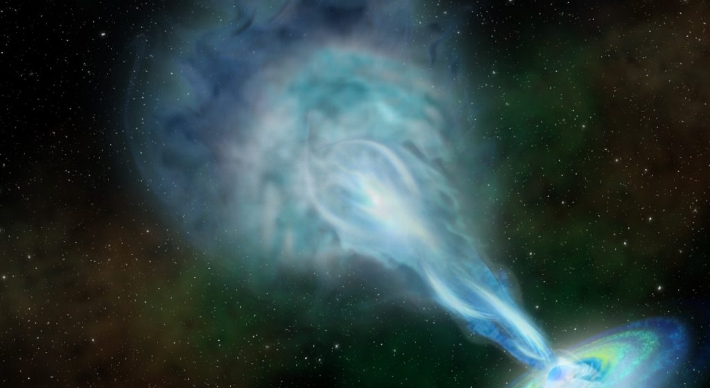 По мнению ученых, квазары— это активные ядра галактик, в центре которых находятся сверхмассивные черные дыры. Они поглощают большое количество материи, из-за чего вокруг них сформировались массивные аккреционные диски. Часть их вещества выбрасывается в окружающее пространство в виде джетов — потоков частиц, движущихся с релятивистскими скоростями. Диски и джеты является мощными источниками излучения, благодаря чему квазары часто называют маяками Вселенной.