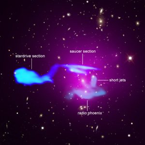 На представленном изображении показан один из подобных гигантов — галактическое скопление Abell 1033, находящееся на расстоянии 1,6 млрд световых лет от Млечного Пути. Снимок является комбинированным и представлен в условных цветах: фиолетовый соответствует результатам съемки рентгеновского телескопа Chandra, голубой — данным сети радиотелескопов LOFAR (Low-Frequency Array). Остальная информация почерпнута из Слоуновского цифрового обзора неба SDSS (оптический диапазон).