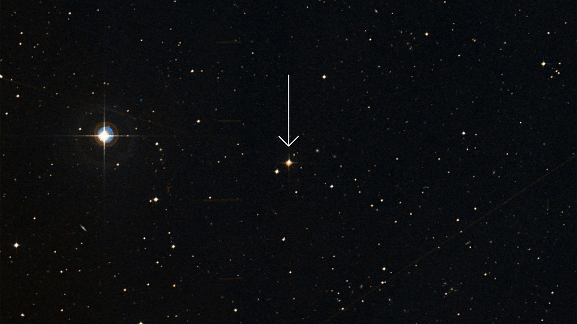 Стрелка указывает на положение красного карлика Росс 573. Источник: SIMBAD/Aladin/DSS