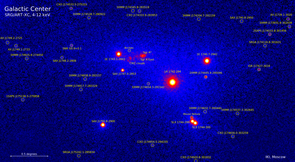 На первом изображении, полученном инструментом СРГ/ART-XC и охватывающем фрагмент площадью около 8 квадратных градусов, можно увидеть центральную область нашей Галактики (балдж). Кружками обозначены источники рентгеновского излучения. В ходе первоначального обзора «Спектр-РГ» смог обнаружить несколько десятков неизвестных ранее рентгеновских источников. Возможно, это аккрецирующие двойные системы с компактным объектом — нейтронной звездой или черной дырой.