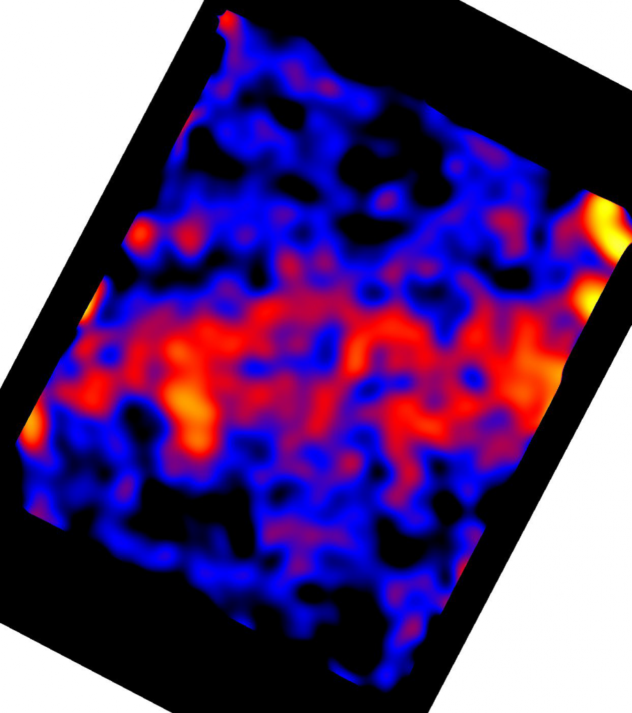 Следующее изображение демонстрирует главную галактическую плоскость. Цветом показана интенсивность фонового рентгеновского излучения, которую можно восстановить после вычета «вклада» точечных источников.