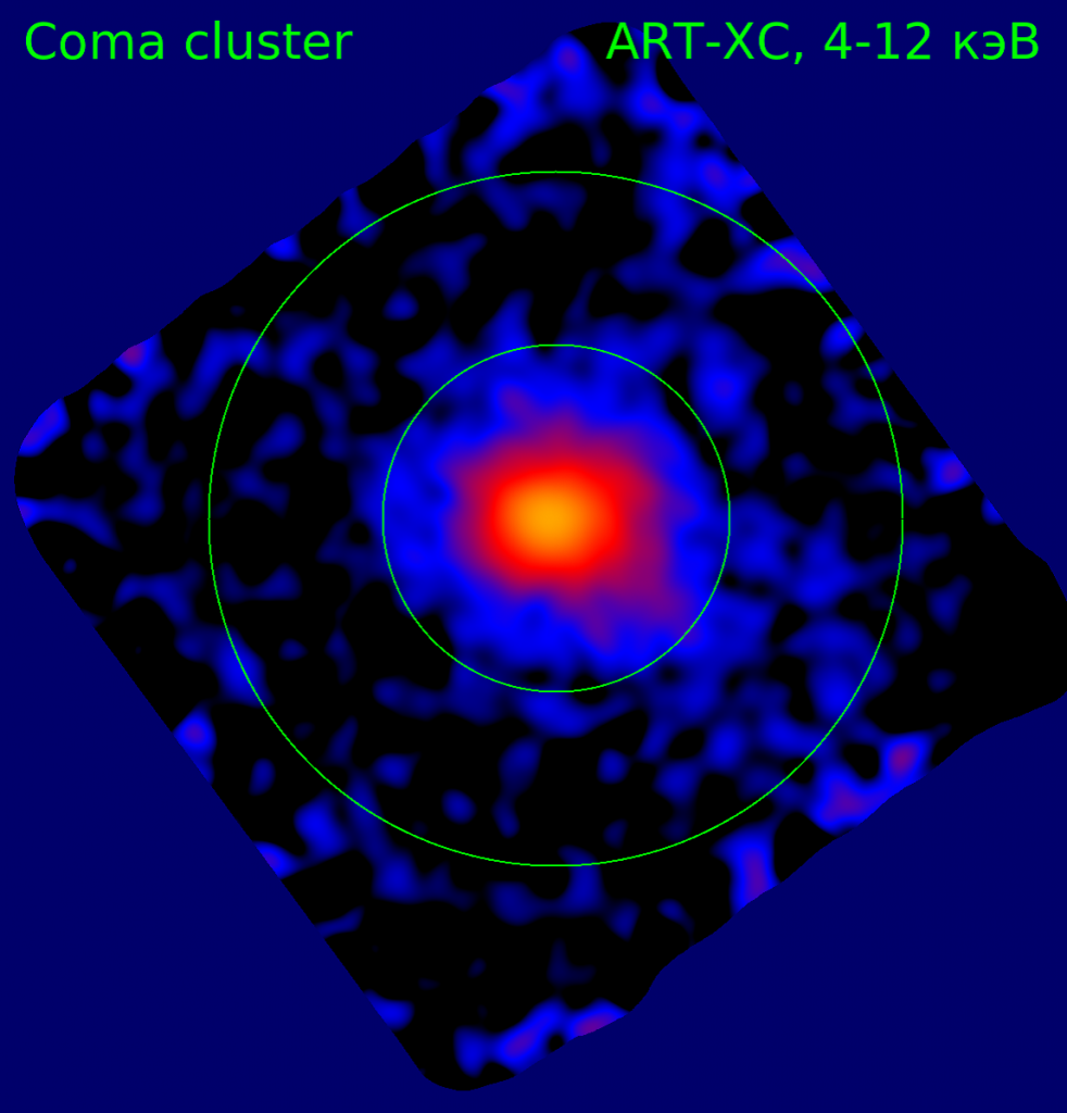 На третьем изображении запечатлено скопление галактик в созвездии Волос Вероники. Оно было получено инструментом СРГ/ART-XC в ходе калибровочных наблюдений. Это изображение дает астрономам возможность исследовать горячий межгалактический газ внутри скопления вплоть до его предполагаемой границы, отмеченной большой окружностью.