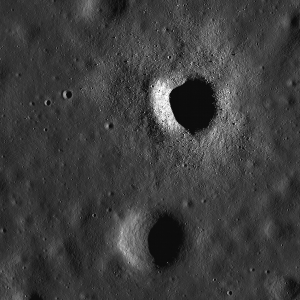 Два лунных кратера примерно одинакового размера. Более молодая ударная формация окружена большим количеством крупных валунов. Источник: NASA/GSFC/Arizona State University