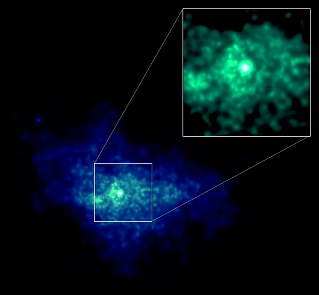 В центре снимка можно увидеть яркий объект. Это остатки ядра звезды-гиганта. Взрыв Сверхновой сжал вещество до такого состояния, что его плотность теперь в несколько раз превышает плотность атомного ядра. Такие объекты называются нейтронными звездами. При диаметре всего в несколько десятков километров они обладают массами, сопоставимыми с массой нашего Солнца.