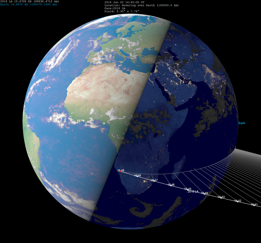 Утром 2 июня телескопы Каталинского небесного обзора обнаружили крохотный астероид диаметром около 2 м. В тот момент он находился за орбитой Луны. Объекту было присвоено обозначение 2018 LA. Расчеты показали, что орбита астероида пересекается с земной и с вероятностью примерно в 85% через несколько часов он упадет на Землю где-то между Австралией и Мадагаскаром.
