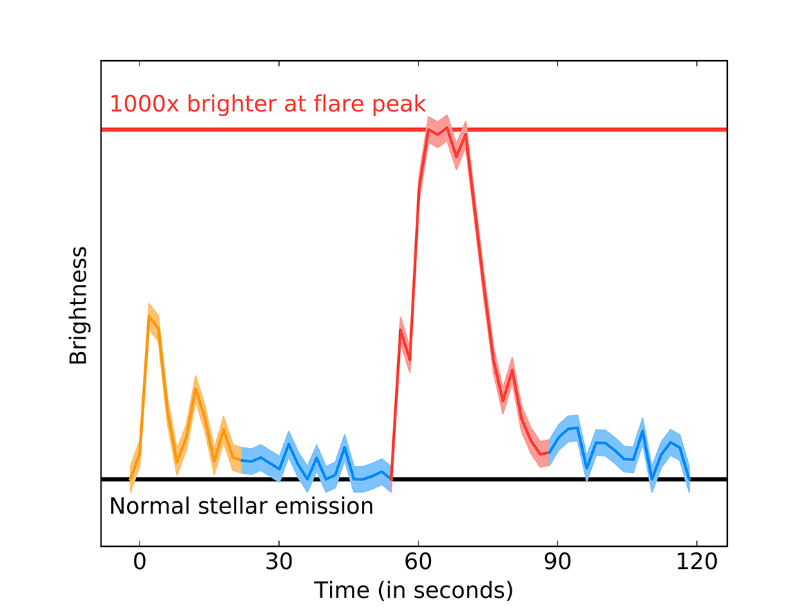 Вспышки на Проксима Центавра, зафиксированные ALMA 24 марта 2017 года. Источник: Meredith MacGregor, Carnegie
