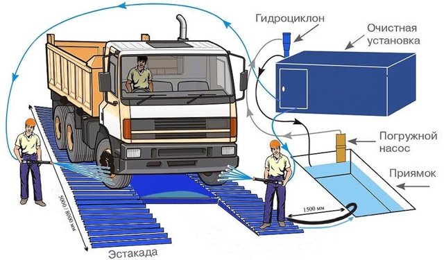 Комплексы действуют по принципу оборотного водоснабжения. Автомобиль заезжает на эстакаду, под напором воды освобождает шины и днище от грязи (грунта, цементной смеси, мусора) и выезжает чистым за территорию объекта. Грязная вода подвергается фильтрации и повторной подаче для обслуживания следующего грузовика.