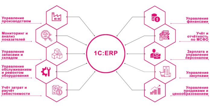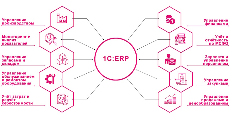 С другой стороны, 1С:ERP — это решение, ориентированное на гибкость и масштабируемость. Оно охватывает те же области, что и Комплексная автоматизация, но предлагает: