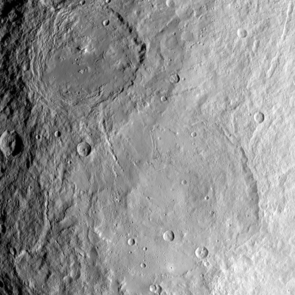 На этом изображении запечатлены две крупных ударных формации на поверхности карликовой планеты Цереры (1 Ceres). В верхней части снимка виден кратер Урвара (диаметром 163 км), в нижней части — 260-километровый кратер Ялоде.
