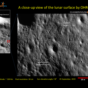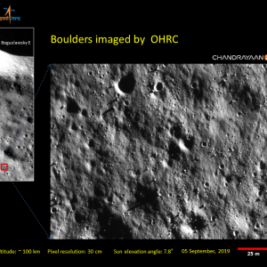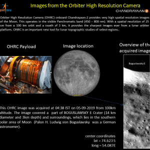 Индийская организация космических исследований (ISRO) опубликовала несколько новых изображений лунной поверхности, сделанных при помощи камеры OHRC (Orbiter High Resolution Camera) автоматического аппарата «Чандраян-2». Снимки демонстрируют дно кратера Богуславский Е. Эта 14-километровая ударная формация расположена в южном приполярном регионе нашего естественного спутника. На фотографиях можно различить множество мелких кратеров, а также булыжники диаметром до 1-2 м.