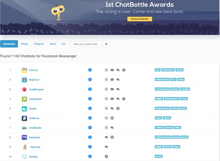 Существует поисковая система Chatbottle, где разработчики информируют о релизах новых ассистентов. Там же составлен рейтинг более 3,5 тысяч автоматизированных систем общения для самых разных мессенджеров.