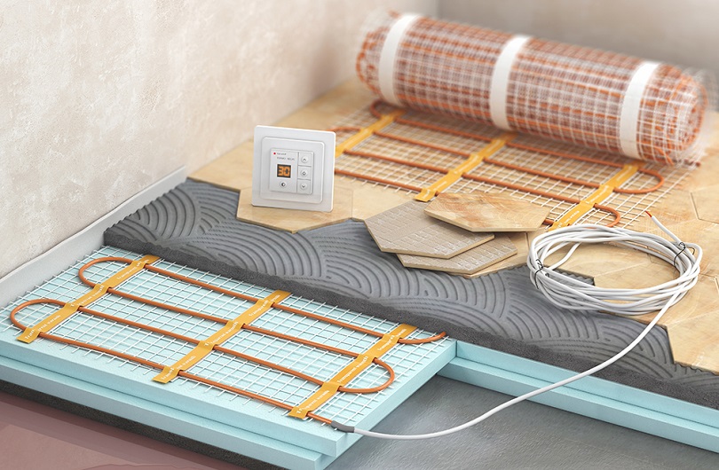Нагрівальні мати можуть бути двох типів: конвекційні та інфрачервоні. І якщо інфрачервоні теплі підлоги це інноваційна система обігріву приміщень, то конвекційні мати це той же кабель, що гріє, але більш тонкий (діаметр кабелю 2,5-4 мм) і закріплений на сітчастій основі з потрібною відстанню між витками кабелю. Тонкі мати укладаються в меншу товщину стяжки, всього до 5-10 мм, або безпосередньо в шар плиткового клею. Такий монтаж не підвищує заплановану висоту підлоги, а сітчаста основа робить установку зручнішою.