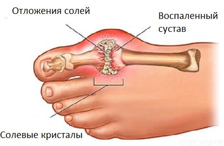 • Пароксизмальная (нападающая) боль в суставах, обычно в большом пальце ноги, но также может затронуть суставы рук, локтей, коленей и других суставов.