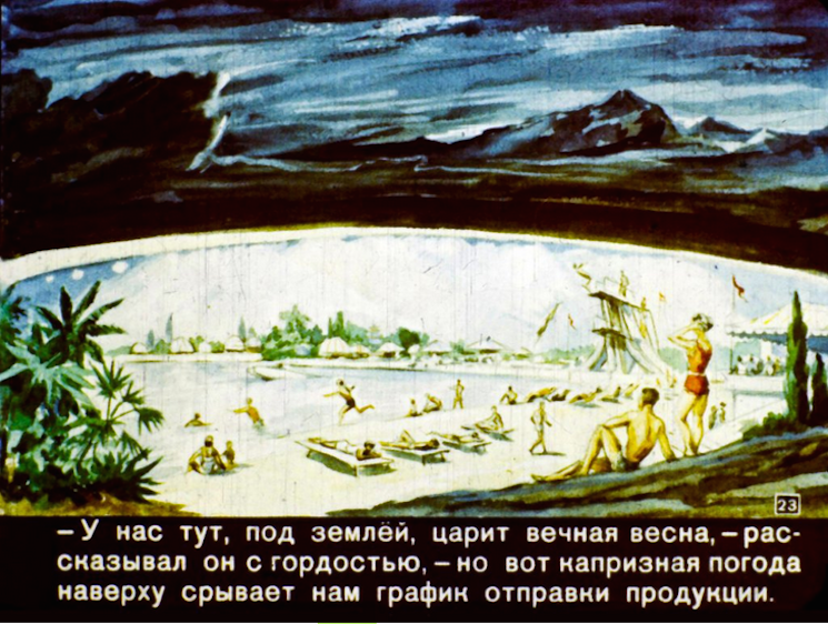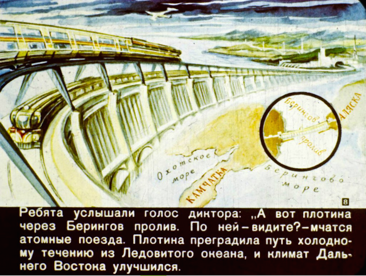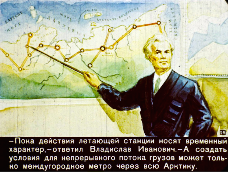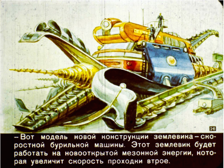 Суровые советские инженеры предлагают создание междугороднего метро через всю Арктику. И куда уж нашей транссибирской магистрали. В качестве землеройных машин используют скоростные бурильные машины, работающие на мезонной энергии.