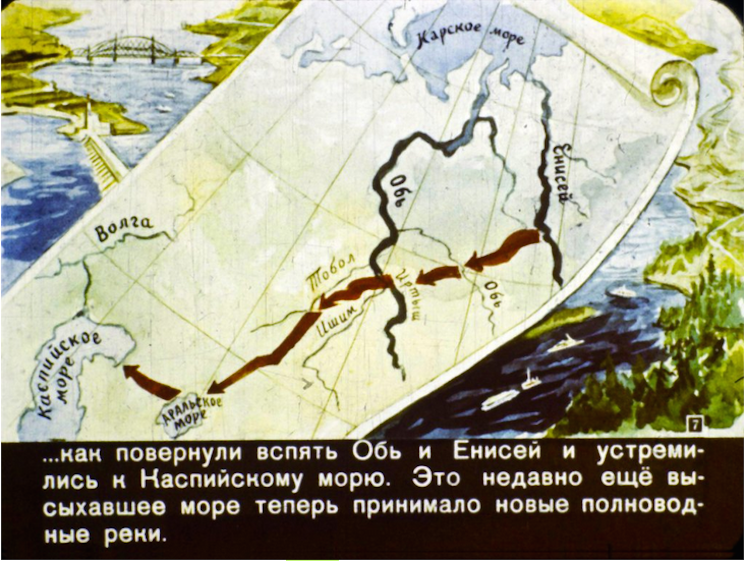 Советские инженеры-гидротехники разворачивают реки Обь и Енисей с целью направить потоки воды в Каспийское море.