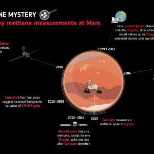 Впервые следы метана в марсианской атмосфере были найдены аппаратом Mars Express в 2004 г. Позже его несколько раз регистрировали в ходе наземных наблюдений. В 2013 г. Curiosity подтвердил эти данные, обнаружив всплеск концентрации метана в районе кратера Гейл. Ученые даже определили примерный район, откуда мог поступить газ.