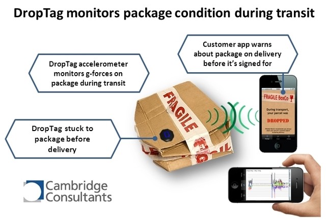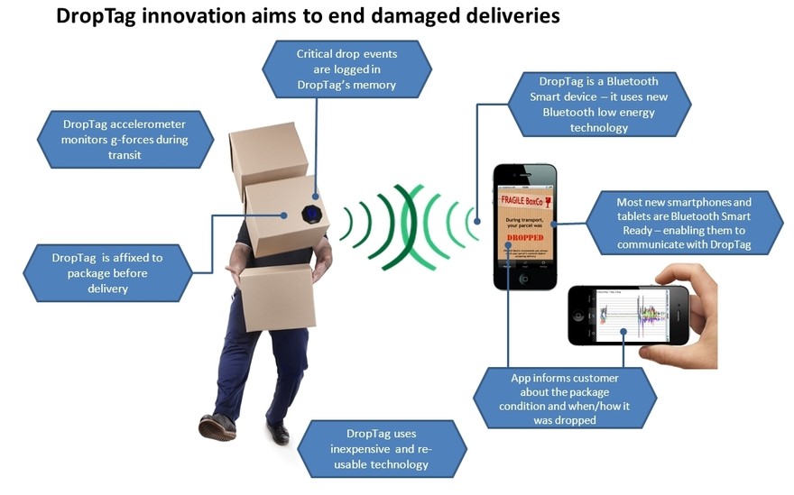 DropTag – это небольшое техническое устройство, себестоимость которого не превышает и двух долларов, разработанное специально для отслеживания всех событий, происходящих с посылкой в пути. Простенький датчик, работающий от батарейки, неделями может фиксировать «судьбу» посылки, включая все чрезвычайные происшествия с ней.