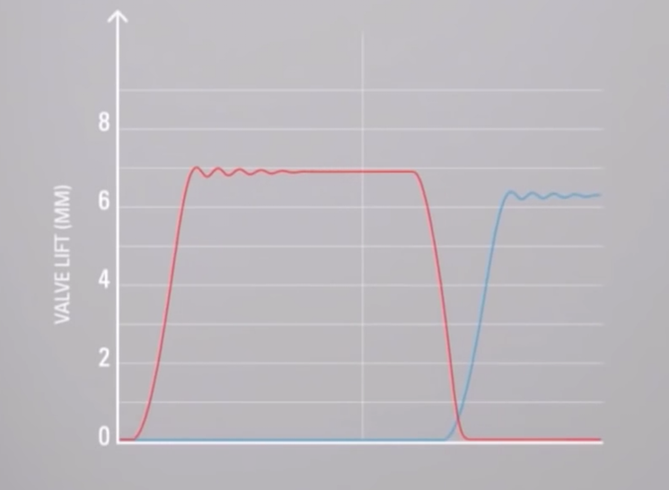 Красная линия отображает характеристику работы впускных клапанов, синий — выпускных. В отличие от классической схемы ГРМ, где как впускные так и выпускные клапана открываются плавно с помощью распредвала по траектории эллипса, в системе Freevalve они открываются фактически мгновенно под действием электрического импульса.