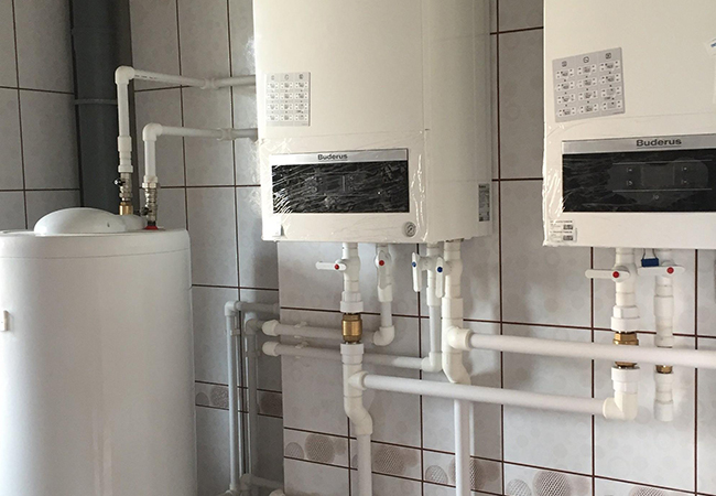Монтаж отопительной системы заключается в установке котла и разведении по стоякам водяных труб. Появление новых технологий позволяет применение особых пластиковых труб горячей воды, благодаря этому упрощается процесс монтажа, увеличивается срок эксплуатации и исключает промерзание воды внутри труб. Схема обязательно должна быть просчитана специалистами для определения достаточной мощности котла и оптимальности разводки труб.