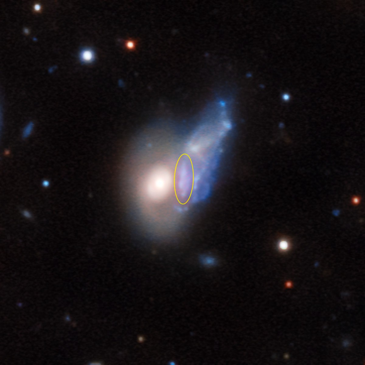 Cветовое эхо выделено желтым кружком. Источник: ESO, P. Merluzzi (INAF-Osservatorio Astronomico di Capodimonte, Italy)