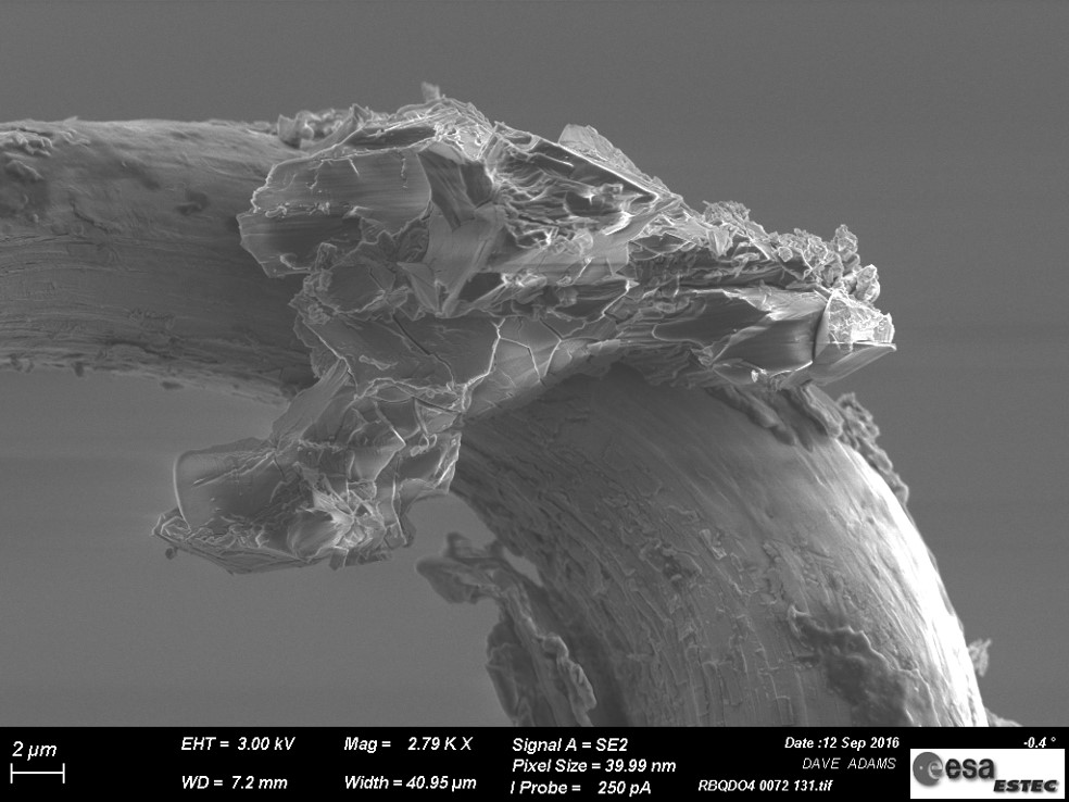 На снимке, сделанном при помощи микроскопа исследовательского центра ESTEC, запечатлена частичка астероида Итокава (25143 Itokawa). Она была доставлена на Землю в 2010 г. японской станцией «Хаябуса». В общей сложности, аппарат собрал около 1500 микрозерен, в основном размером 10 мкм и менее. В порядке научного обмена, 3 частицы были переданы в распоряжение ESA.