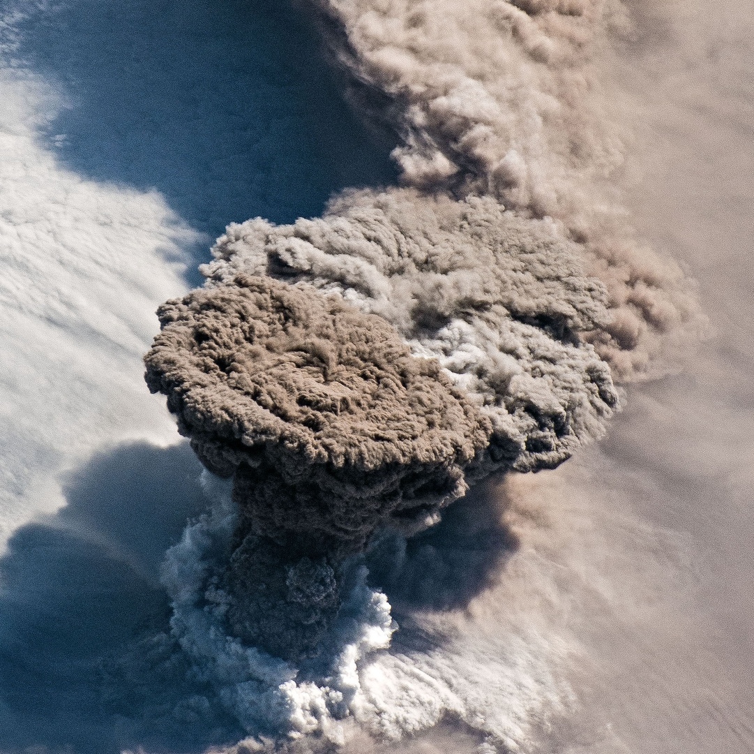 Но наиболее эффектный снимок Райкоке был сделан экипажем МКС. Фотография от 22 июня во всех деталях демонстрирует столб вулканического пепла и газов. У его основания видны характерные белые облака. По одной из версий, они образуются при конденсации влаги во втягивающемся в выброс холодном воздухе. Согласно второй теории, облака возникли в результате попадания потоков магмы в морскую воду.