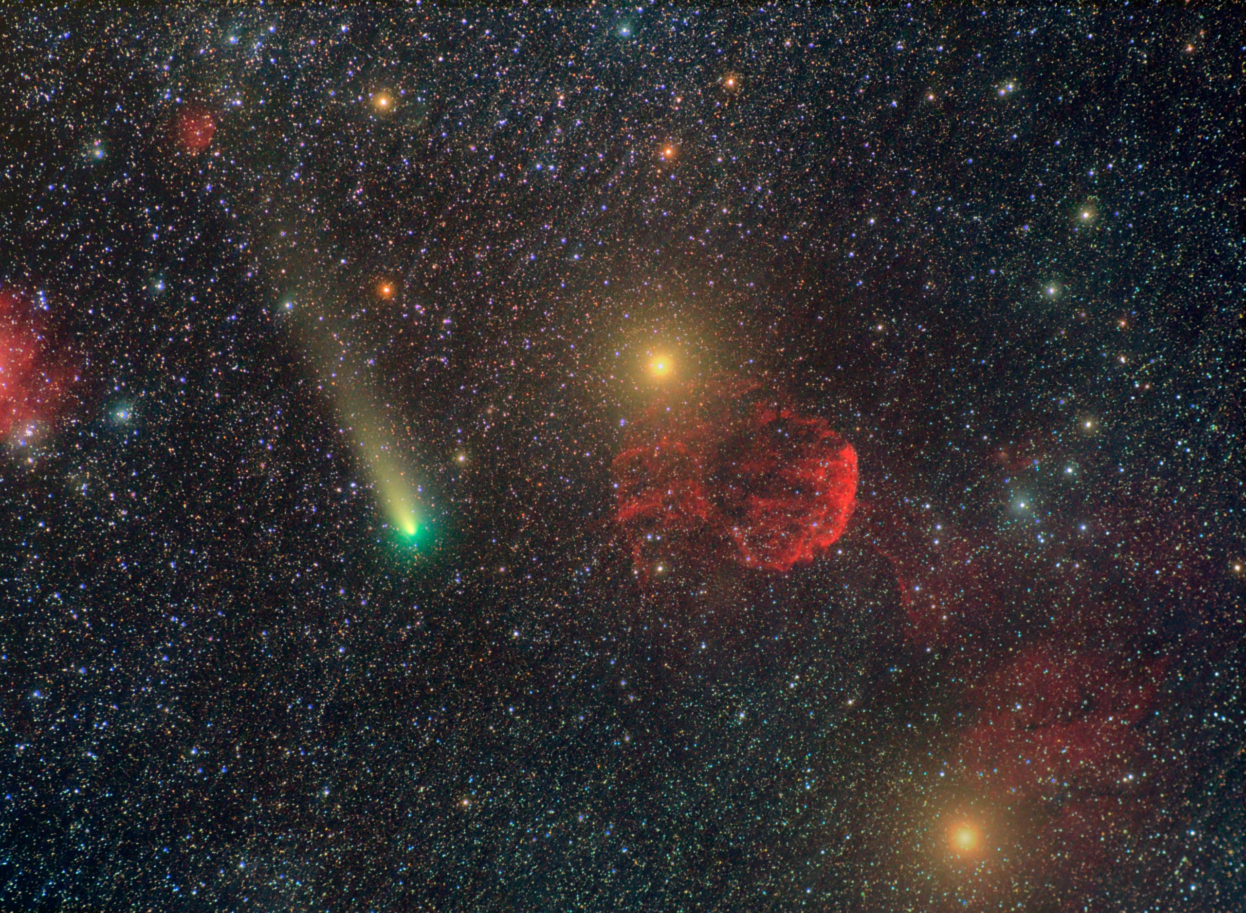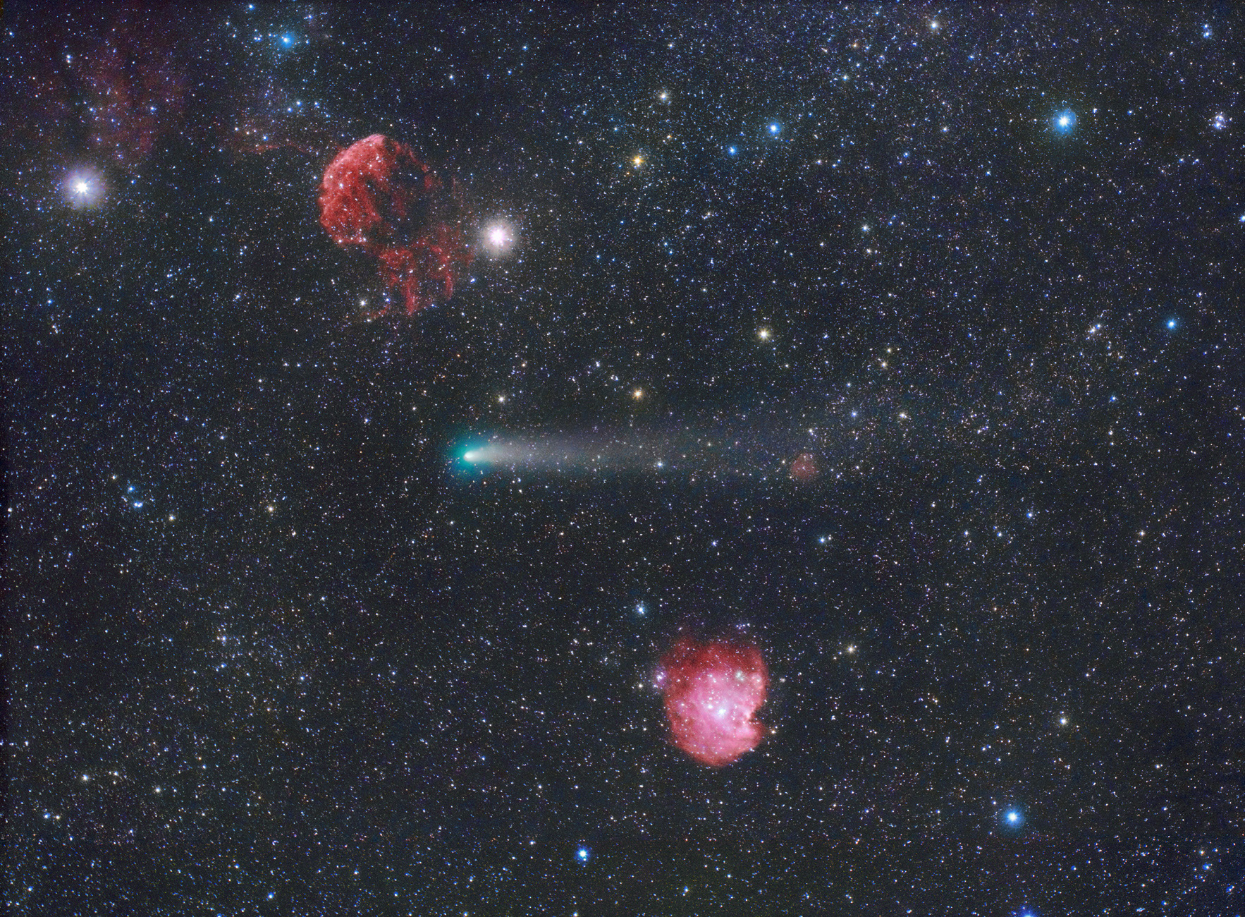 Представленные снимки были сделаны 17 сентября этого года астрономами-любителями Михаэлем Йегером (Michael Jäger) и Петром Митрофановым. На них можно увидеть короткопериодическую комету Джакобини-Циннера (21P/Giacobini-Zinner) на фоне двух объектов дальнего космоса: эмиссионной туманности NGC 2174 (также известна как «Обезьянья Голова») и остатка сверхновой IC 443.