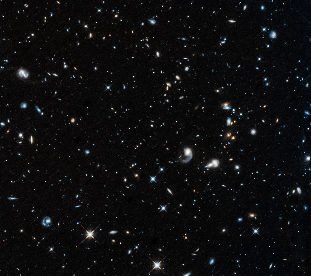 На этой фотографии телескопа Hubble запечатлен небольшой участок неба в созвездии Пегаса, расположенный недалеко от астеризма Большой Квадрат. На снимке можно увидеть множество далеких галактик, в которых некогда происходили процессы активного звездообразования. Испущенному ими свету потребовалось около 11 млрд лет, чтобы добраться до Земли.