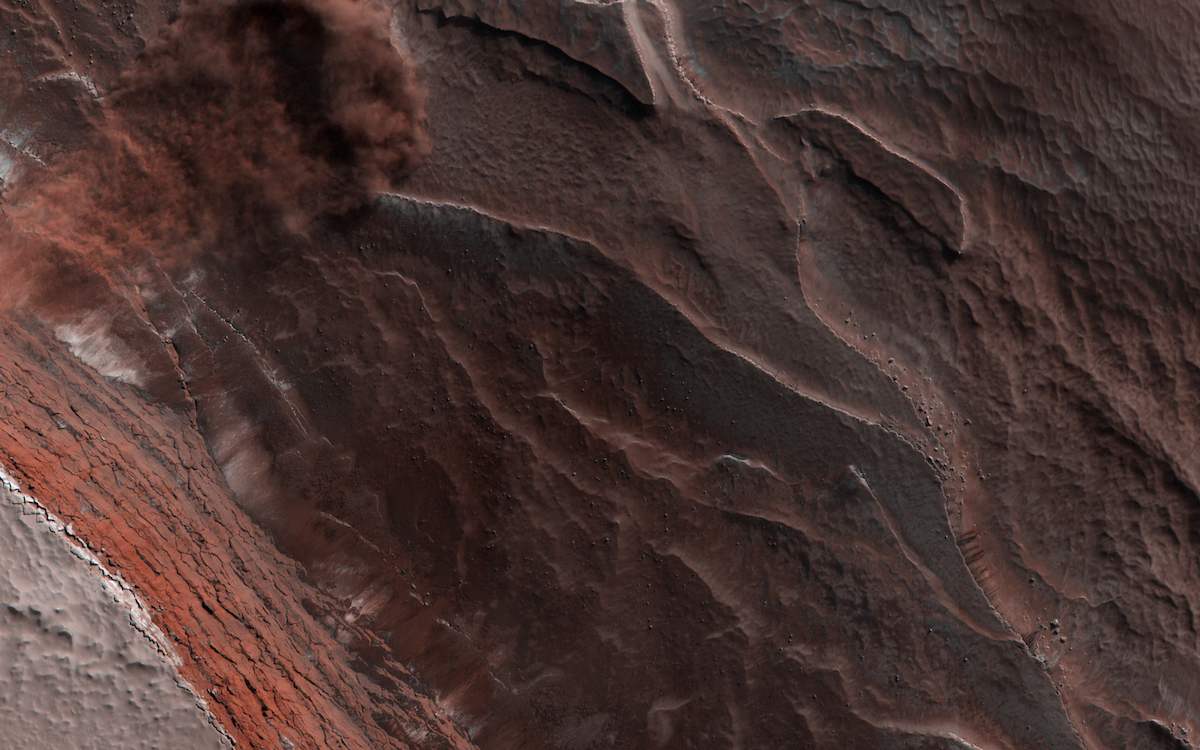 Представленное изображение было получено 29 мая 2019 г. камерой HiRISE, установленной на борту аппарата MRO. На нем видна пыль, поднятая в результате схода лавины в северном полярном регионе Марса.