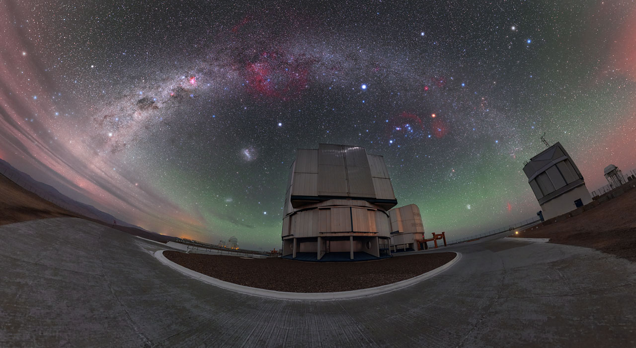 Это прекрасное изображение демонстрирует ночное небо над Европейской южной обсерваторией ESO, расположенной на вершине горы Серро Параналь в чилийской пустыне Атакама. В самом центре кадра можно увидеть башню одного из четырех основных «юнитов» Очень Большого Телескопа (VLT).