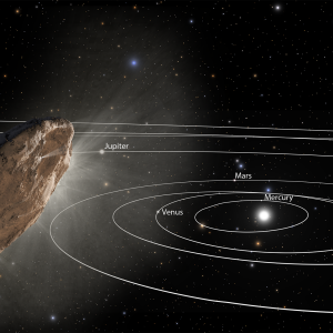 Осенью прошлого года астрономы обнаружили в Солнечной системе первый подтвержденный межзвездный объект, получивший название Оумуамуа (1I/’Oumuamua). Он прилетел примерно со стороны звезды Вега и прошел на расстоянии 0,25 а.е. от Солнца (внутри орбиты Меркурия), после чего ушел от него по траектории, навсегда уводящей этот объект из сферы притяжения нашего светила.