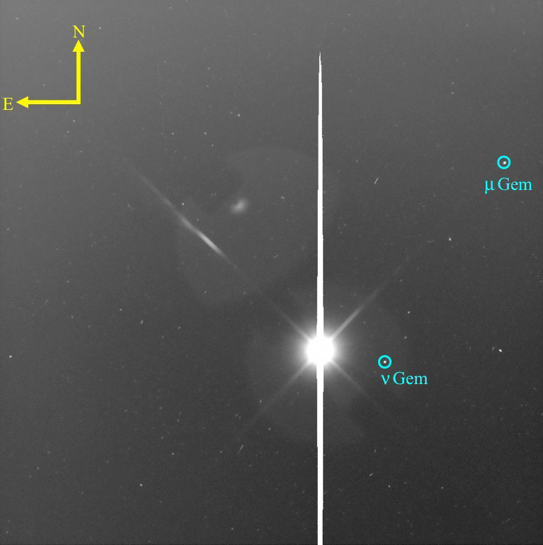Астероид Рюгу с дистанции 920 км. Изображение сделано навигационной камерой с выдержкой 178 с. На заднем фоне можно увидеть звезды созвездия Близнецов. Источник: JAXA, University of Tokyo, Kochi University, Rikkyo University, Nagoya University, Chiba Institute of Technology, Meiji University, University of Aizu and AIST.