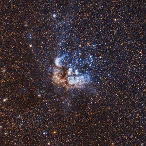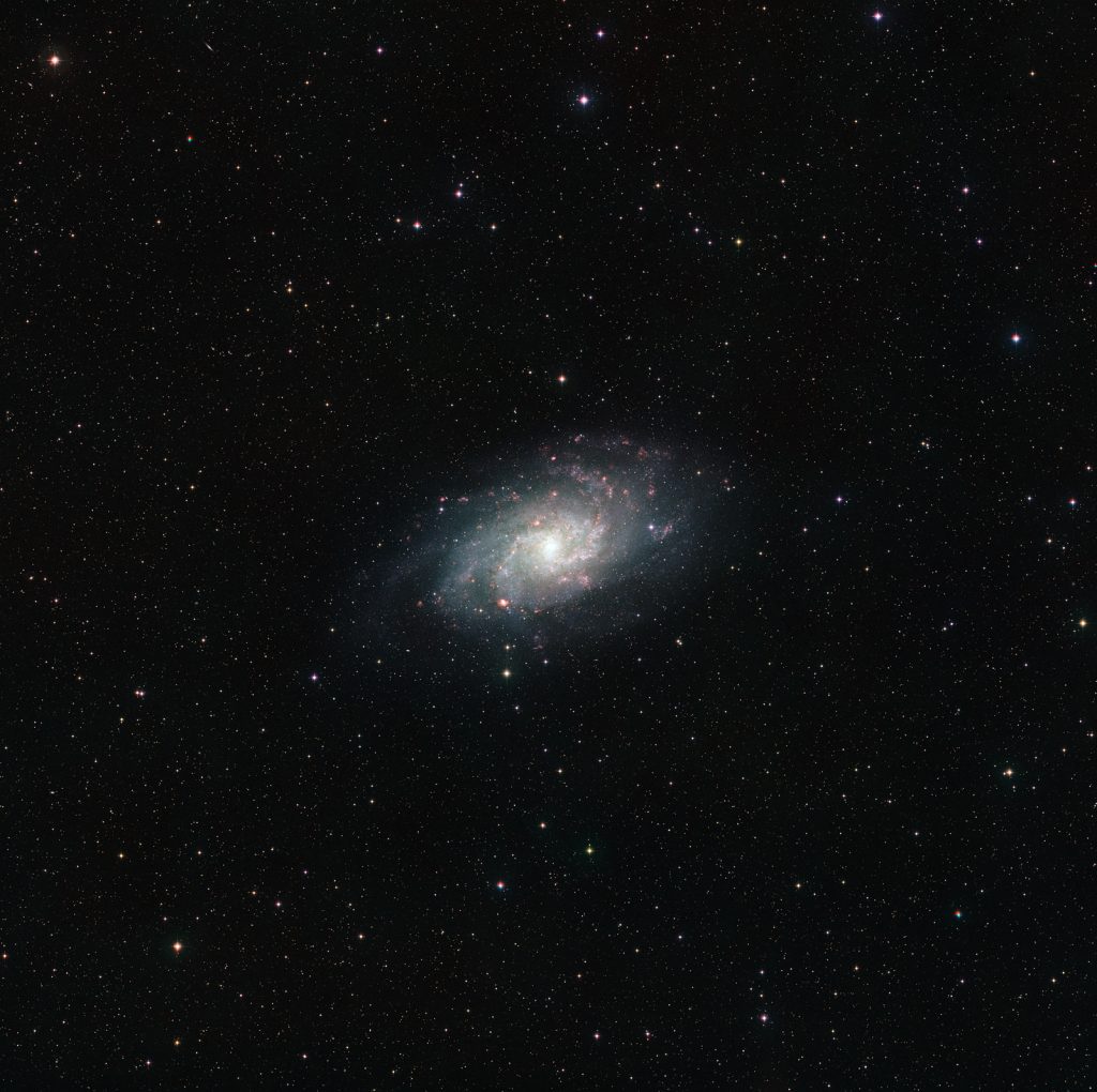 В отличие от Млечного Пути и Туманности Андромеды, галактика Треугольника не имеет перемычки. Это значит, что ее спиральные рукава «произрастают» прямо из галактического ядра. Она также весьма богата межзвездным газом и пылью, из которых активно формируются новые светила. На изображении можно увидеть две самые крупные области звездообразования — туманности NGC 595 и NGC 604.