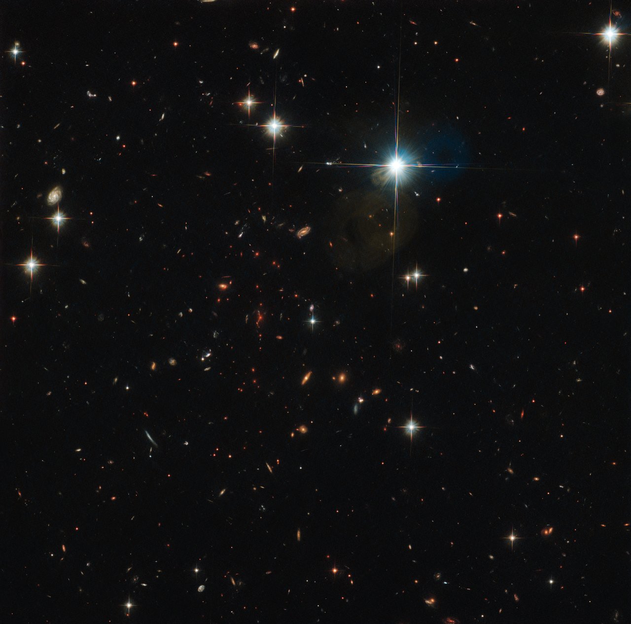 Эта фотография была сделана космическим телескопом Hubble. На ней запечатлен участок неба в районе южного созвездия Живописца. В центре изображения можно увидеть группу тусклых красных объектов — галактик, входящих в состав скопления SPT-CL J0615-5746 (SPT0615).