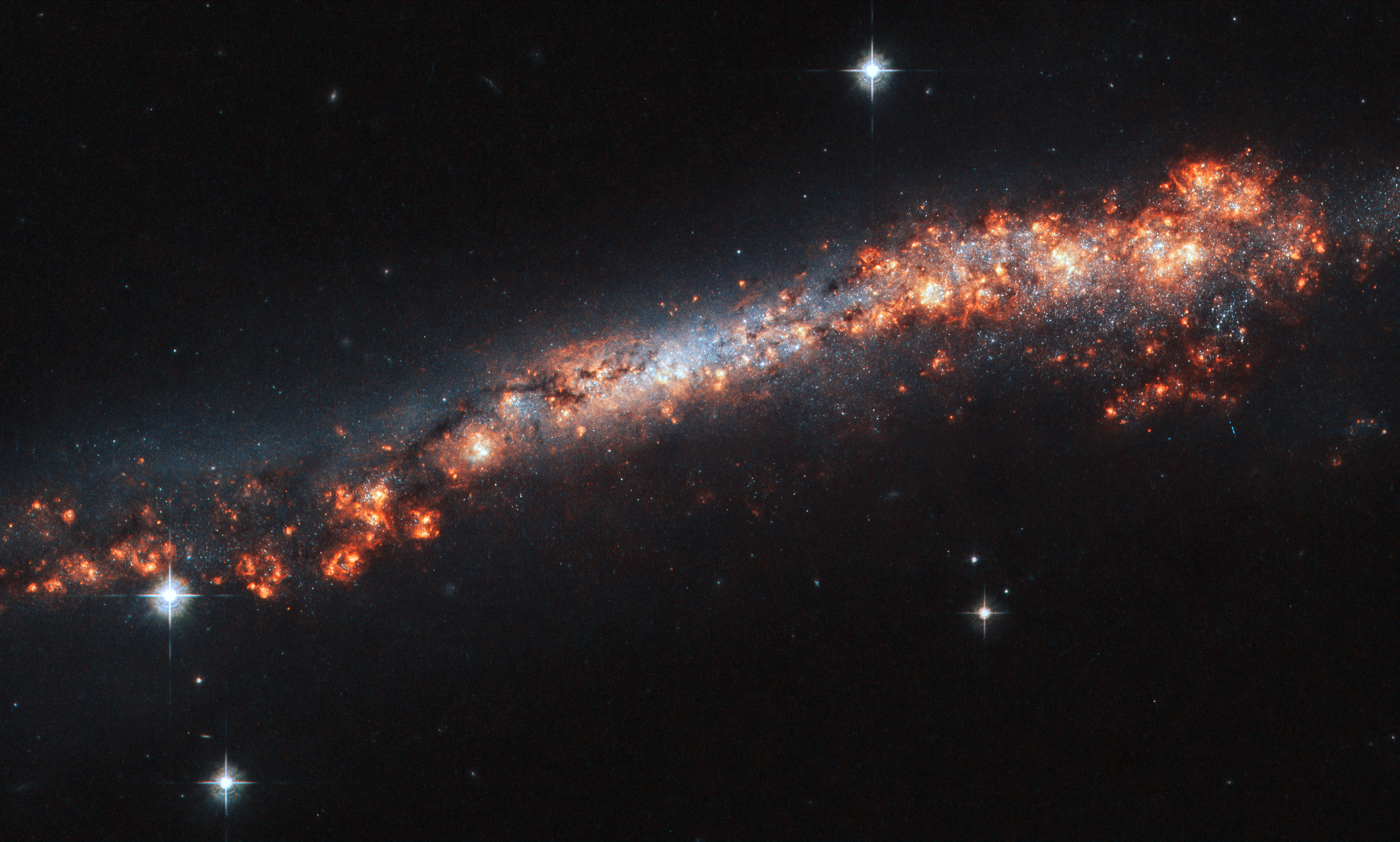 Все дело в точке зрения. Мы видим NGC 3432 «с ребра» — таким образом, нашим обсерваториям доступны для наблюдения лишь ее окраинные регионы, в то время как спиральные рукава и яркое ядро остаются скрытыми от нас.