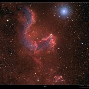 Звезда вращается с огромной скоростью: материя на ее экваторе движется со скоростью 1,6 млн км/ч — в 200 раз быстрее аналогичного показателя Солнца. Это приводит к периодическим изменениям яркости светила и выбросам большого количества вещества, из которого вокруг него сформировался диск. Мощное излучение γ Кассиопеи «бомбардирует» водород, входящий в состав IC 63, заставляя его светиться (на снимке это свечение показано красным цветом). Частицы пыли туманности также отражают часть падающего на них света — она показана условным синим цветом.