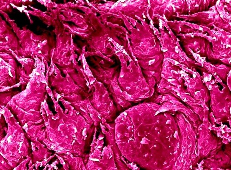 Изображение эпидермиса человека полученное при помощи электронного сканирующего микроскопа. Примерно за 27 дней поверхностный слой кожи человека полностью обновляется.