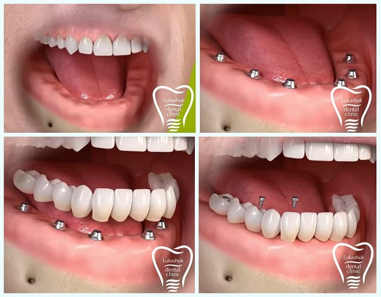 Первый этап — это установка самого импланта. Он представляет собой титановую конструкцию с резьбой, по форме и размерам напоминающую корень зуба. На десне делается надрез, в костной ткани челюсти сверлится отверстие, в которой вкручивается искусственный корень. Со временем имплант интегрируется в альвеолярный отросток, что обеспечивает стабильность конструкции. Это занимает несколько месяцев. Только после полного приживления можно переходить к протезированию. Для обеспечения жевания и эстетичности на время остеоинтеграции титанового стержня для пациента изготавливают съемный протез, временно закрывающий дефект.