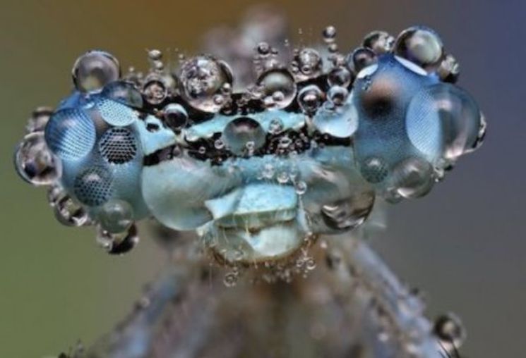 Через росу, как сквозь увеличительное стекло отлично видно фасетчатую структуру глаза стрекозы.