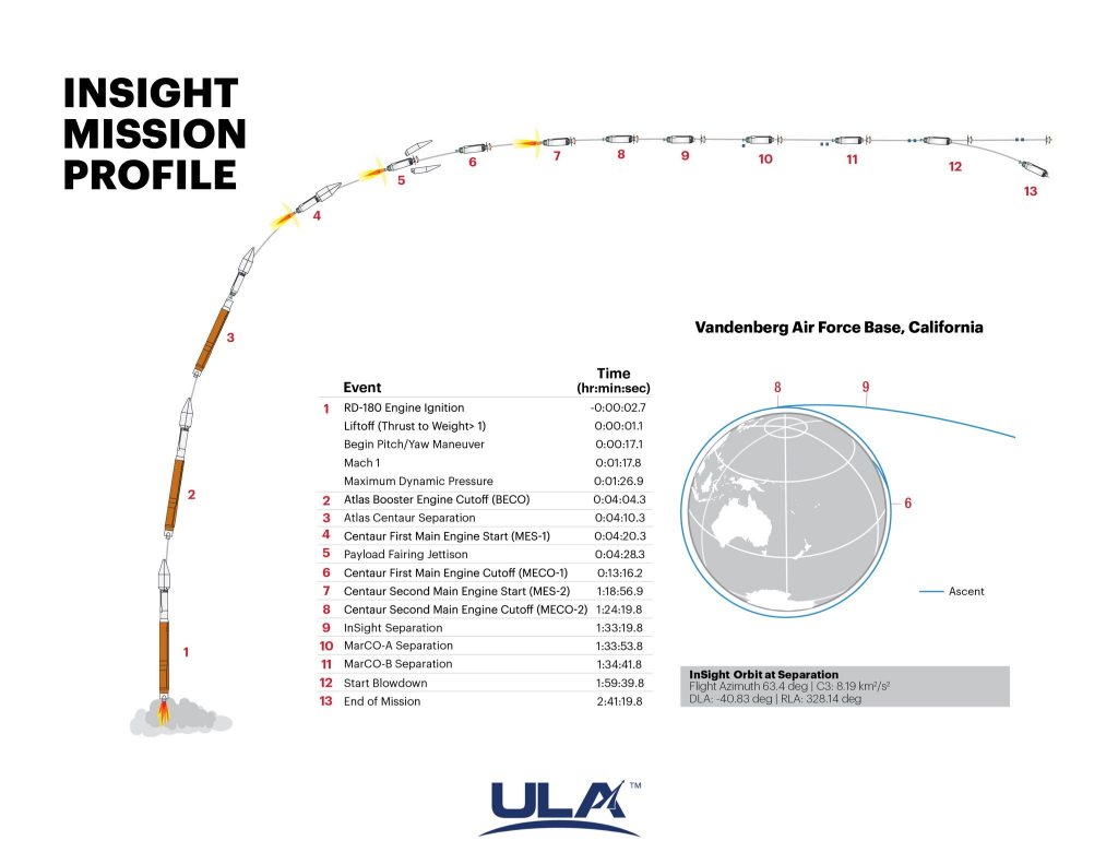 Сегодня с космодрома Ванденберг должен состояться запуск ракеты Atlas V. На ее борту находятся аппарат InSight и пара экспериментальных наноспутников. Если все пройдет в соответствии с планом, уже через 1,5 часа после того как ракета оторвется от стартового стола, они отправятся в путешествие к красной планете.