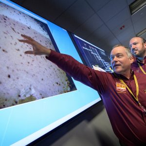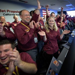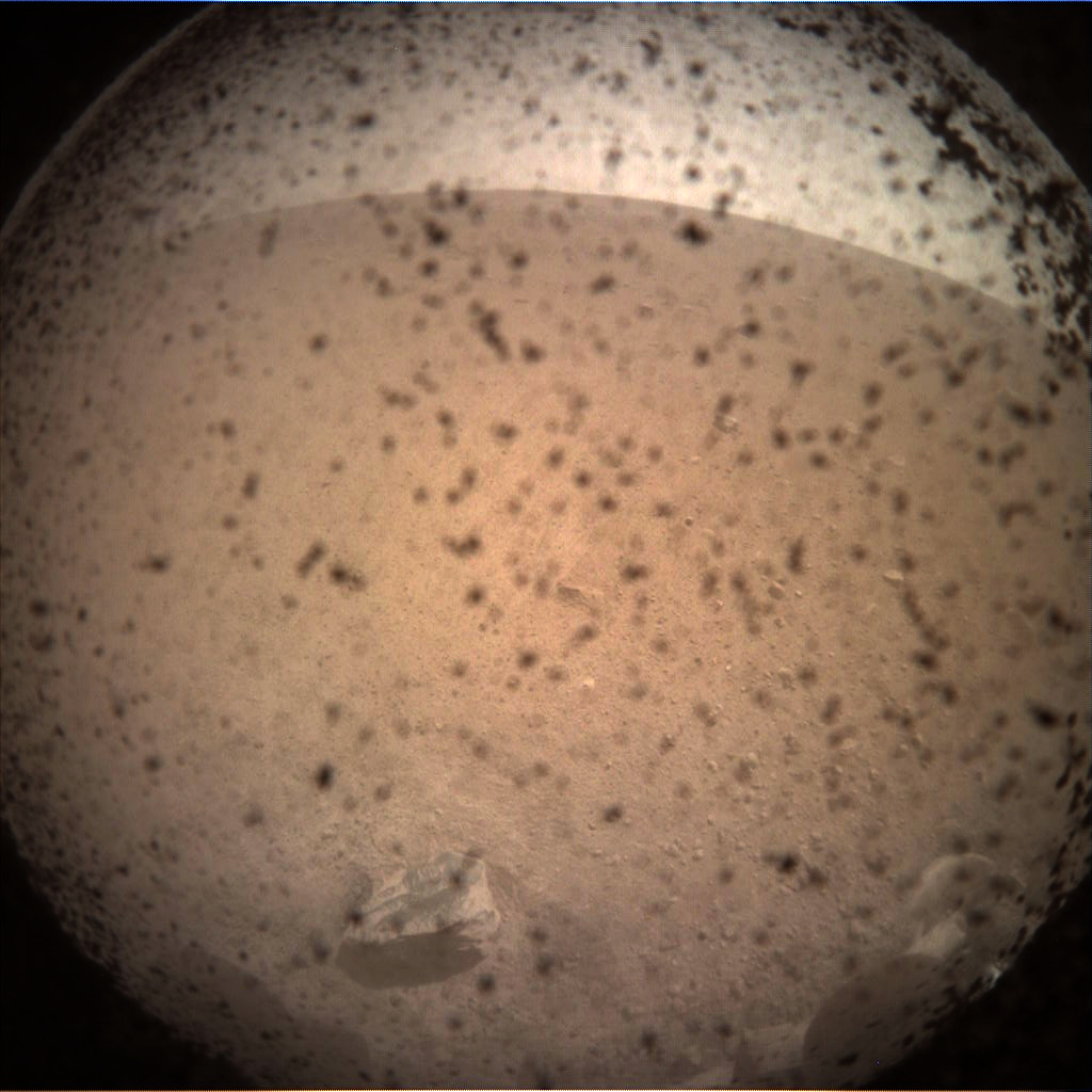 Вечером 26 ноября точно по расписанию аппарат InSight вошел в атмосферу Красной планеты и через семь минут совершил мягкую посадку в районе Нагорья Элизий (Elysium Planitia). Далее он успешно раскрыл солнечные батареи и уже передал на Землю первое изображение с поверхности Марса. Покрывающие его многочисленные черные точки — это пыль. В момент съемки на объективах камеры еще находились пылезащитные чехлы. Позже они будут сброшены.